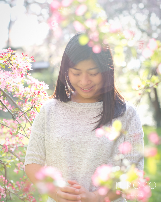 (左は逆光、右はそのまま180度回転して太陽の方を向いてもらいました。この違いといったら、、、すごいでしょう。左の写真は、見えない架空のブーケを持ってもらっています)