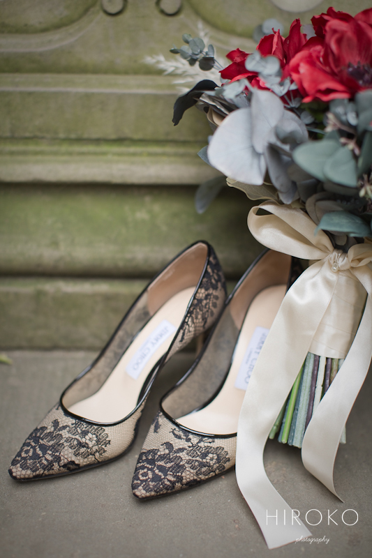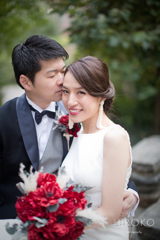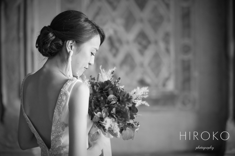 品格のあるヘア、紅いルージュと同じカラーのブーケ、流れるようなクラシカルなドレス。