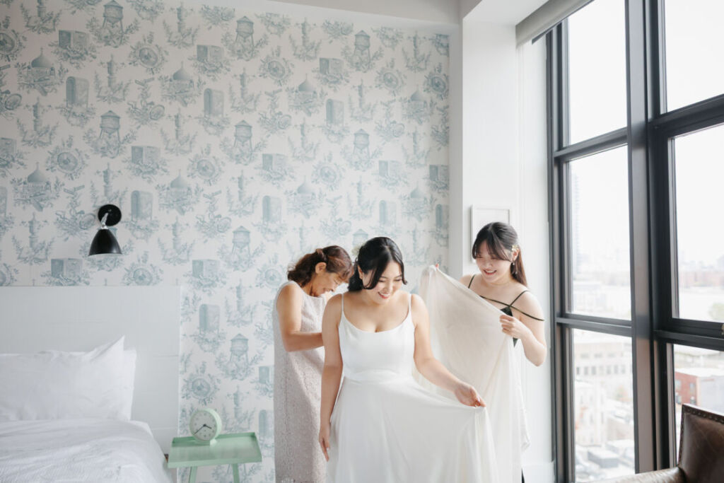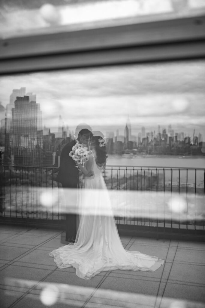 With the Manhattan skyline stretching out before them, anticipation builds for the bride’s first look after finishing her preparations.