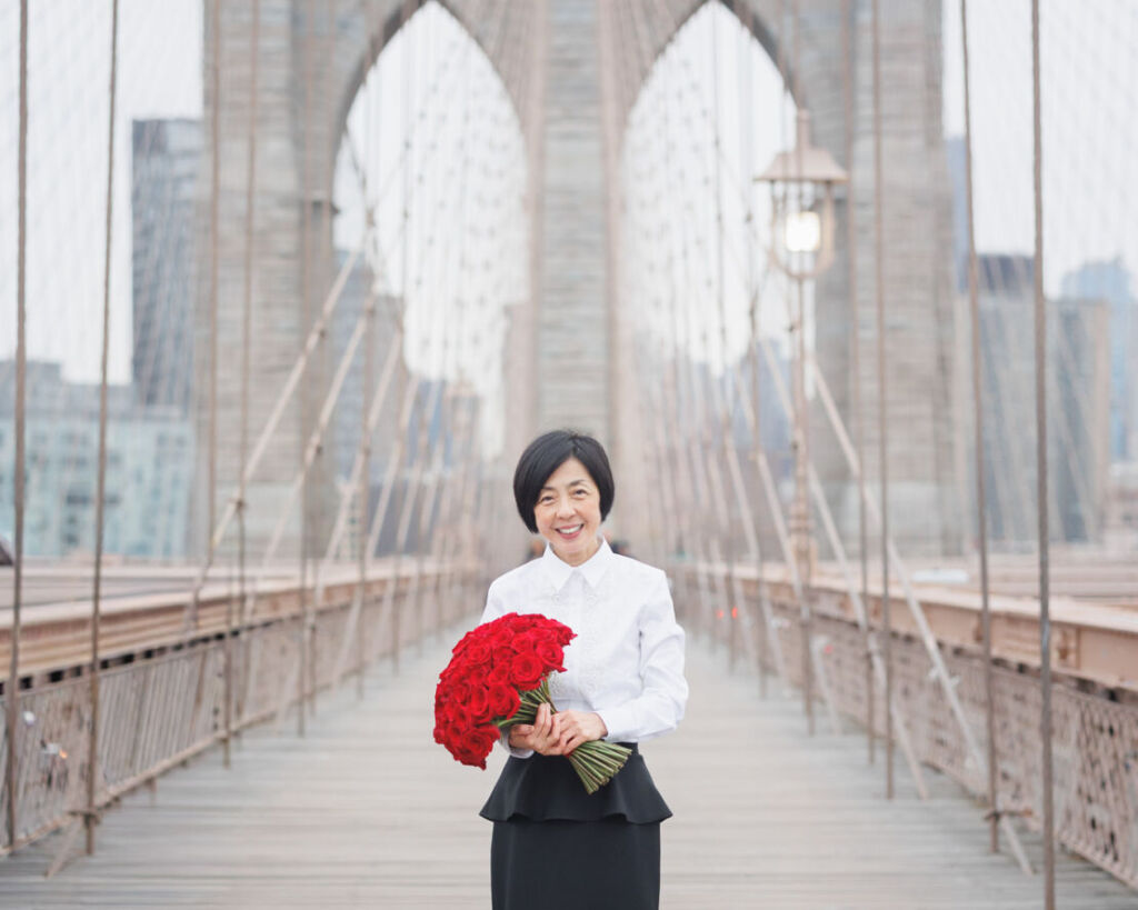 brooklyn bridge(ブルックリン橋)でお祝いのブーケを腕に