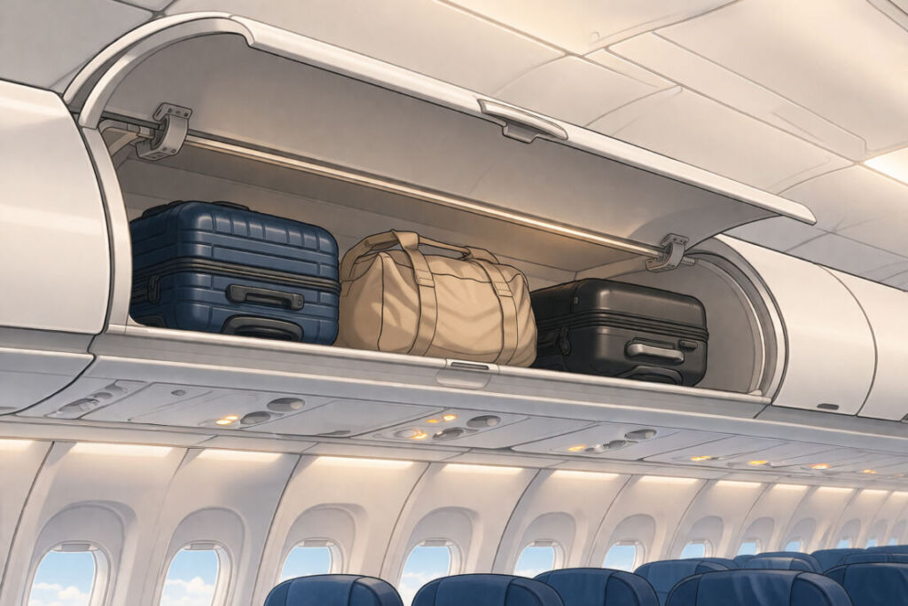 荷物入れにはいくつかタイプがあり、扉を上に開けるタイプであれば、スーツケースの上などに置いて保管しやすいのですが、下から閉めるタイプの場合は、少し注意が必要です。