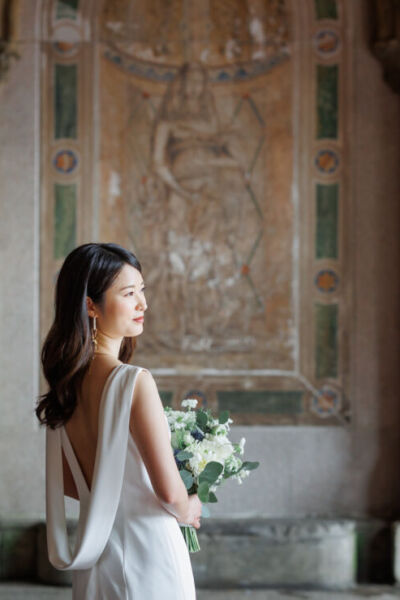 NYウェディングフォト:ドレープが流れるバックコンシャスドレス