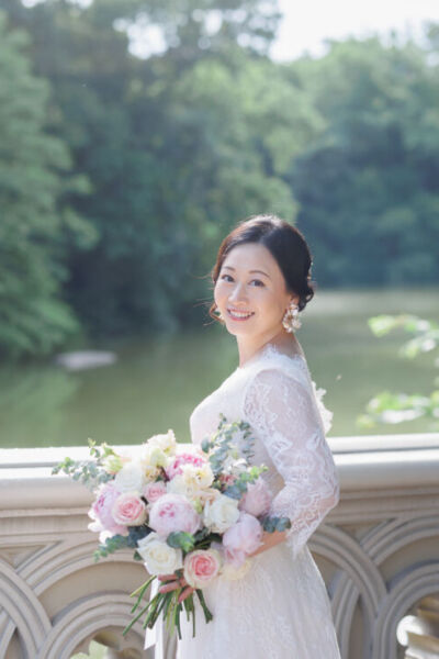 NYウェディングフォト:ボウブリッジに立つ優美な花嫁さま